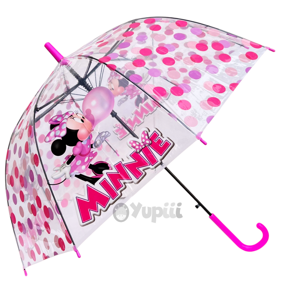 Desde logo, o guarda-chuva transparente é adornado com motivos da Minnie Mouse, destacando os seus icónicos laços brancos e bolinhas vermelhas que flutuam alegremente sobre o fundo cristalino. As cores vibrantes criam um contraste encantador contra a transparência. Consequentemente, torna-se não apenas um acessório utilitário, mas uma peça de estilo que celebra o universo Disney. Além disso, o diâmetro de 45cm é ideal para crianças, oferecendo proteção completa sem ser pesado!